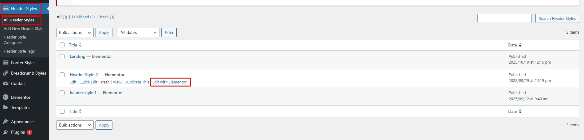 Edit with Elementor – Open the header directly in Elementor to have full control over its design, layout, and content.