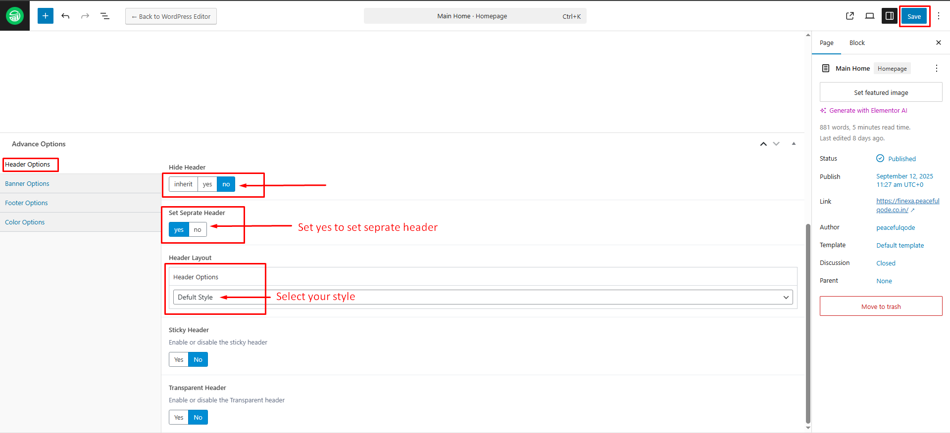 Then, select your desired header from the Header Options dropdown.